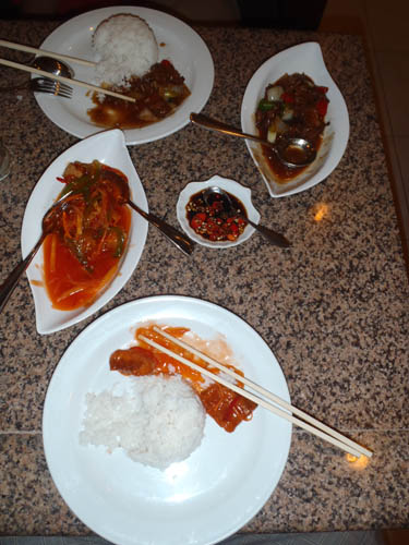 Jídlo pro dva. Zapomněl jsem fotit, tak se omlouvám, ale jídlo už je rozjedené 🙂 Rýže je v této restauraci také výborná. Takhle dobrou rýži jsem ještě nejedl.